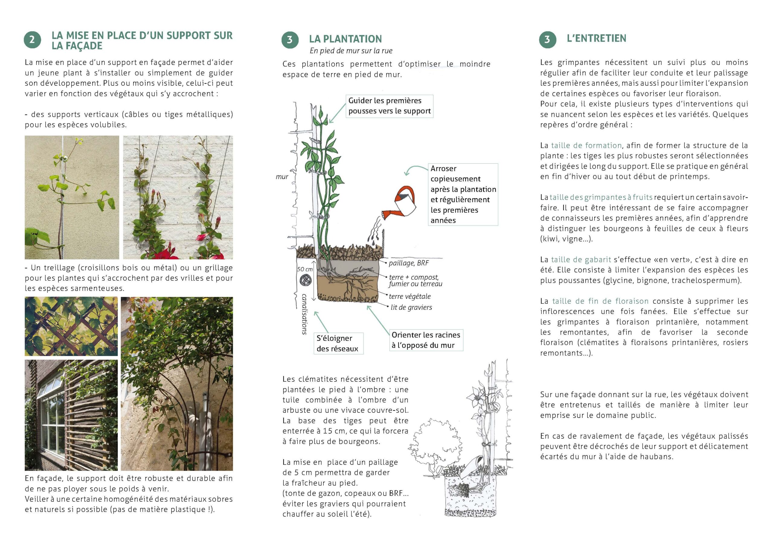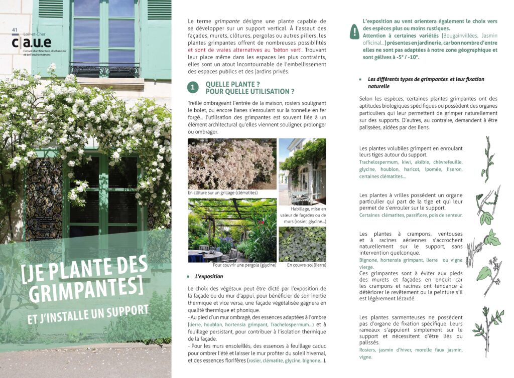 Quelle plante pour quelle utilisation, l’exposition, la mise en place d’un support sur la façade, mise en terre et entretien : cette fiche pratique « Je plante des grimantes et j’installe un support » concentre les points à ne pas négliger.