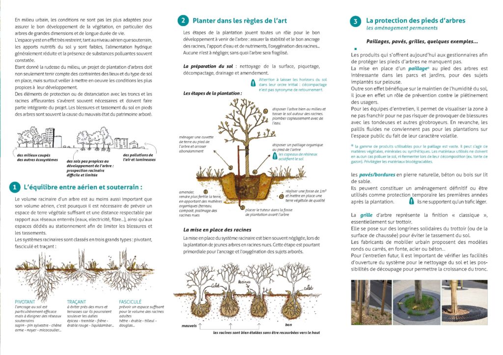 De la plantation à la gestion, la fiche pratique « Je protège les pieds d’arbres » résume de qu’il faut retenir pour apporter à l’arbre les meilleures conditions de vie et de développement : comprendre l’équilibre entre l’aérien et le souterrain, planter dans les règles de l’art et connaître les aménagement de protection des pieds d’arbre, qu’ils permanents ou provisoires (lors de chantiers par exemple).